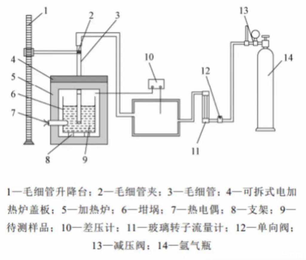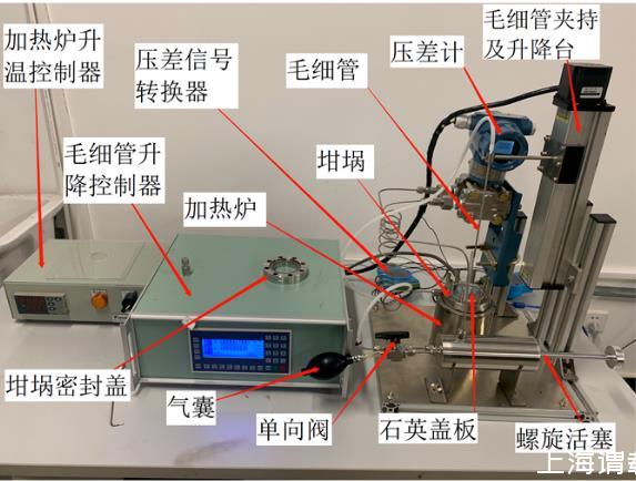 下圖為本文設(shè)計的測量裝置原理示意圖與實(shí)物圖,該裝置主要由4個系統(tǒng)組成:氣路系統(tǒng)、毛細(xì)管升降系統(tǒng)、加熱恒溫系統(tǒng)以及數(shù)據(jù)采集系統(tǒng)。