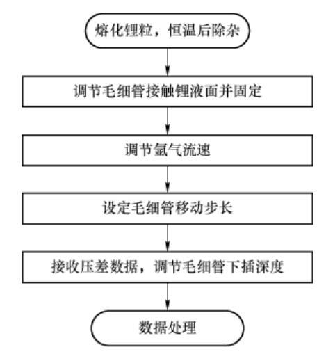 被測材料為鋰粒,純度為99.974%,總金屬雜質(zhì)為260×10-6。鼓泡所用氣體為高純氬氣,純度≥99.999%,符合GB/T 4842—2017標(biāo)準(zhǔn)。為避免高溫環(huán)境下雜質(zhì)對實(shí)驗(yàn)結(jié)果的影響,將實(shí)驗(yàn)臺架放置在充氬氣環(huán)境的手套箱內(nèi),箱內(nèi)壓力為+200~400Pa,氧含量小于0.5×10-6,水含量小于0.2×10-6。實(shí)驗(yàn)基本流程如圖3所示。