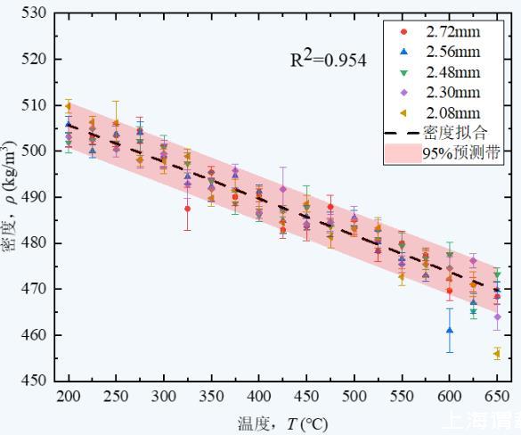 上圖5給出了溫度T在200~650℃范圍內(nèi),使用不同管徑毛細(xì)管測量的液態(tài)鋰密度實(shí)驗(yàn)值及其擬合曲線。可知,擬合結(jié)果具有良好線性度。各個溫度點(diǎn)的密度實(shí)驗(yàn)結(jié)果偏差小于±5 kg/m3,相對誤差為±1%,且實(shí)驗(yàn)結(jié)果均在線性擬合95%預(yù)測帶中,其中預(yù)測帶表示對多次實(shí)驗(yàn)結(jié)果分析,充分考慮實(shí)驗(yàn)偶然誤差,單次實(shí)驗(yàn)結(jié)果在預(yù)測帶之間,說明實(shí)驗(yàn)結(jié)果具有較好可信度。