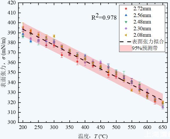 上圖6給出了溫度T在200~650℃范圍內(nèi),使用不同管徑毛細(xì)管測量的液態(tài)鋰表面實(shí)驗(yàn)值及其擬合曲線。可知,擬合結(jié)果具有良好線性度。各個溫度點(diǎn)的密度實(shí)驗(yàn)結(jié)果偏差小于±5 mN/m,相對誤差為±1.4%,且實(shí)驗(yàn)結(jié)果均在線性擬合95%預(yù)測帶中,說明實(shí)驗(yàn)結(jié)果具有較好可信度。